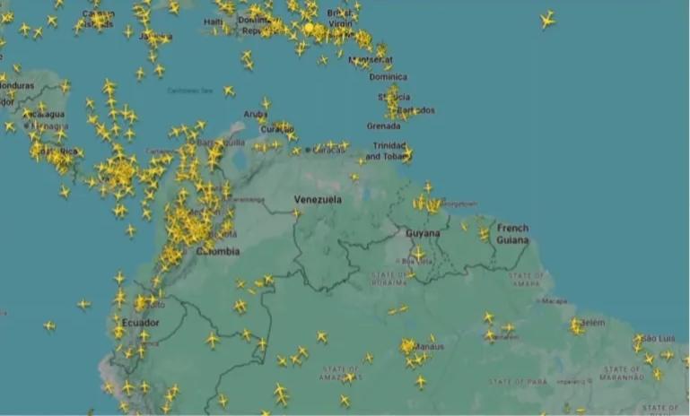 تصویری از پلتفرم ردیابی پرواز Flightradar۲۴ نشان میدهد که ترافیک هوایی غیرنظامی بر فراز حریم هوایی ونزوئلا بسیار کم یا صفر است.